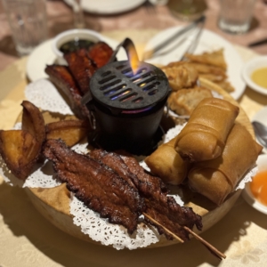 So the first thing that makes a place like this are the Tiki cocktails that have been around since the 1940s and 1950s. Tiki drinks all (or should) have one thing in common, they all contain rum, and it is in fact National Rum Day (only I would know that thanks to my cocktail loving friends on Twitter). The Navy Grog should have all three types of rum: Silver or white, gold and dark, combine with fruit juices. What I loved about this place is, they float the dark rum on the top of the crushed ice. Delicious and it packs a punch. I ordered a Planter’s Punch but he brought back another Navy Grog. No problem, I know once a drink is poured there is no recovering that expense on the restaurant’s end, it either gets tossed or someone in the kitchen drinks it. Still, there is no profit and all loss, so the first one was so good, I insisted I would have another. Also on the cocktail menu of exotic drinks was a Volcano for Two, and this thing was huge, literally the diameter, or so it seemed, of a soccer ball. And, at $17 per drink, that had better be enough for 3 people. Maybe next time.